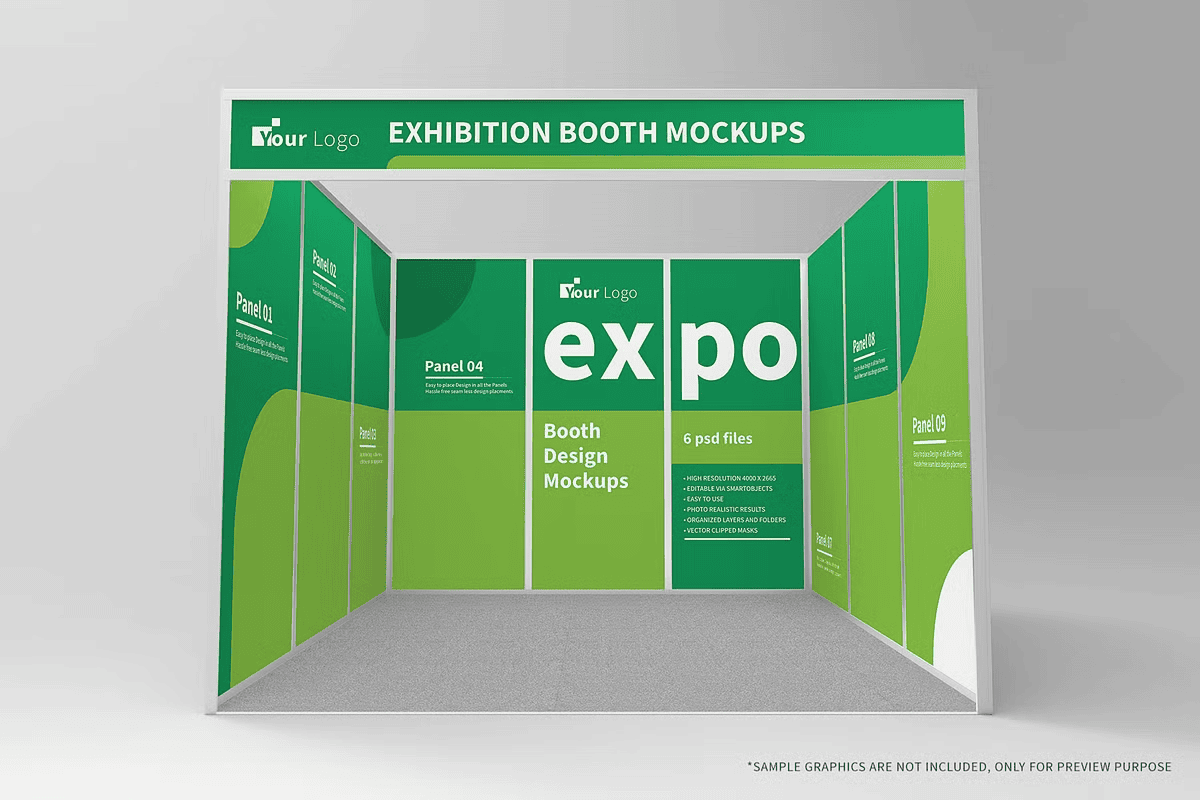Each of the six PSD files presents a unique booth configuration, allowing you to visualize your brand in diverse trade show environments—whether it’s a compact corner stand, a spacious island layout, or a modern minimalist setup. All designs are optimized for seamless integration into any presentation workflow. Use smart object layers to insert your logos, branding elements, signage, or product displays with one click. The layered structure ensures every component remains editable, so you can adapt the design to match your specific event, theme, or brand identity without starting from scratch.