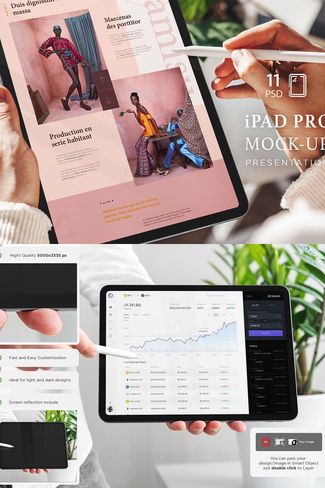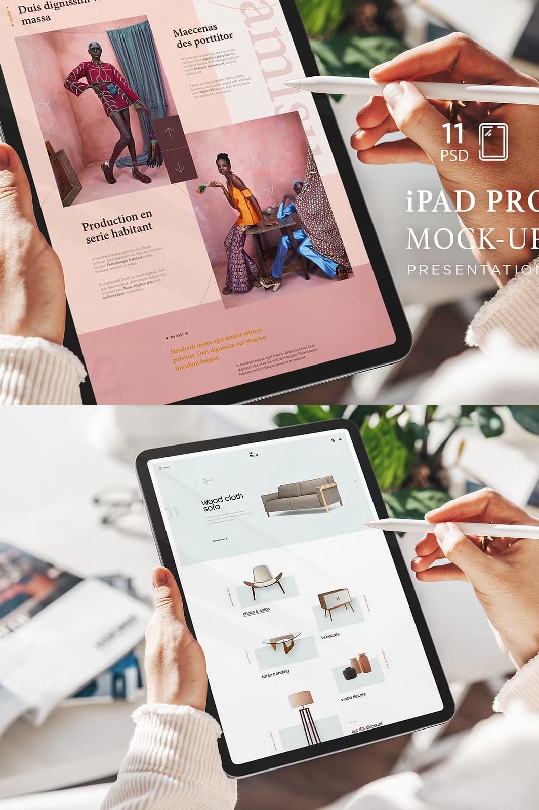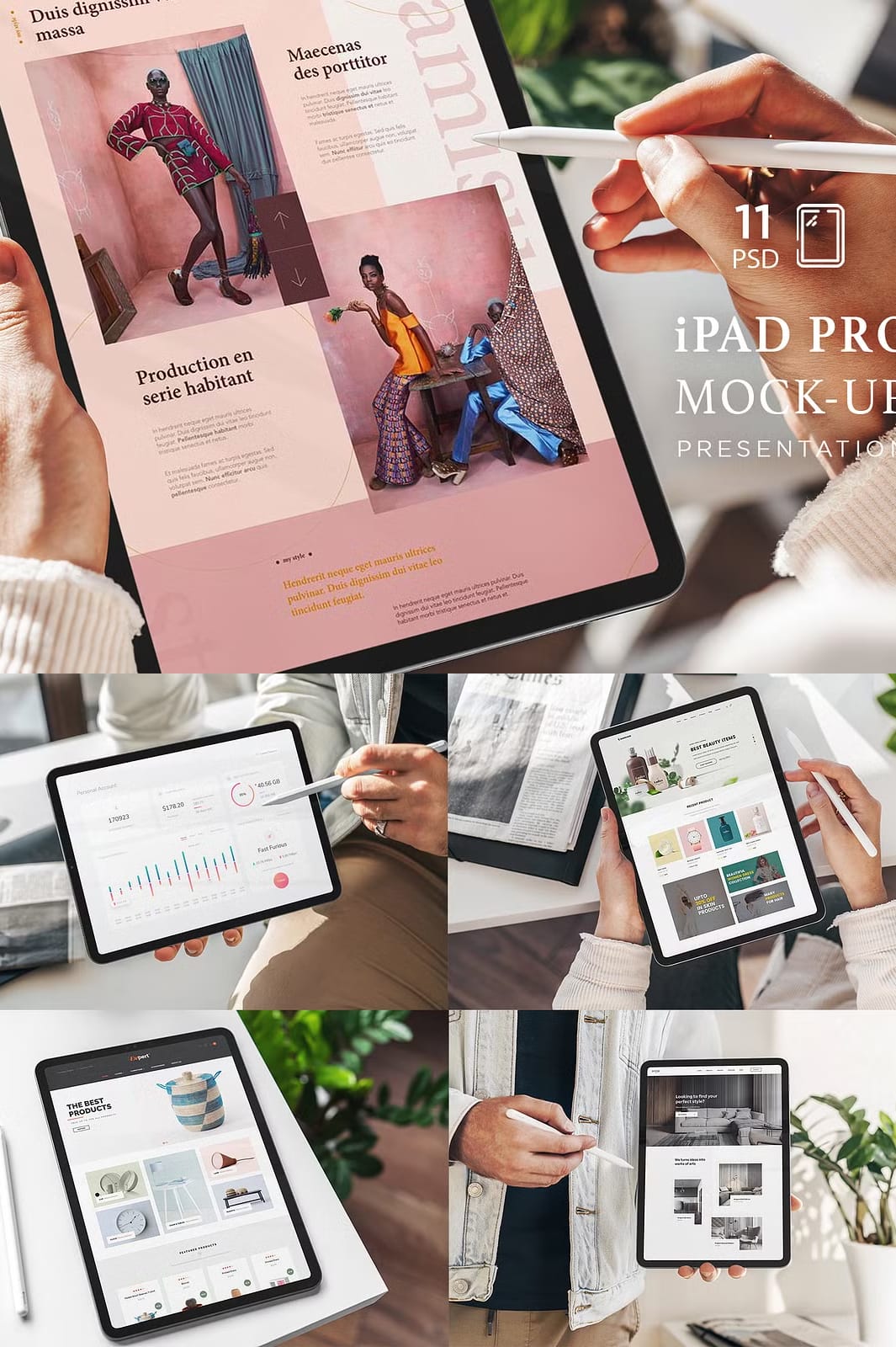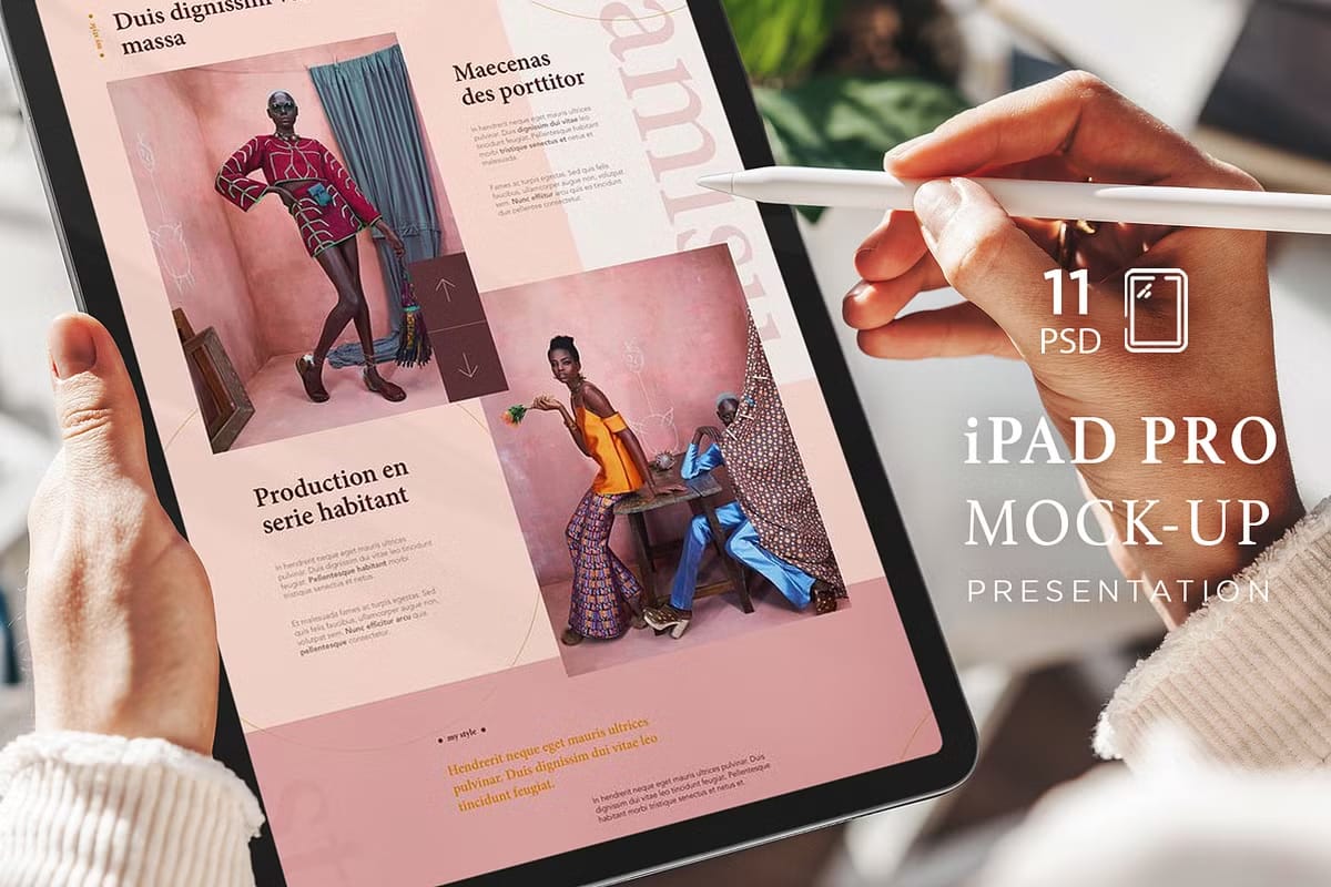 This collection includes 11 PSD presentation files featuring real photos with male and female hands holding the iPad Pro, adding authenticity and relatability to your designs. The mockups support both bright and dark designs, ensuring your work looks great regardless of color scheme. Organized and named layers make navigation simple, while the included JPG help file guides you through the editing process.