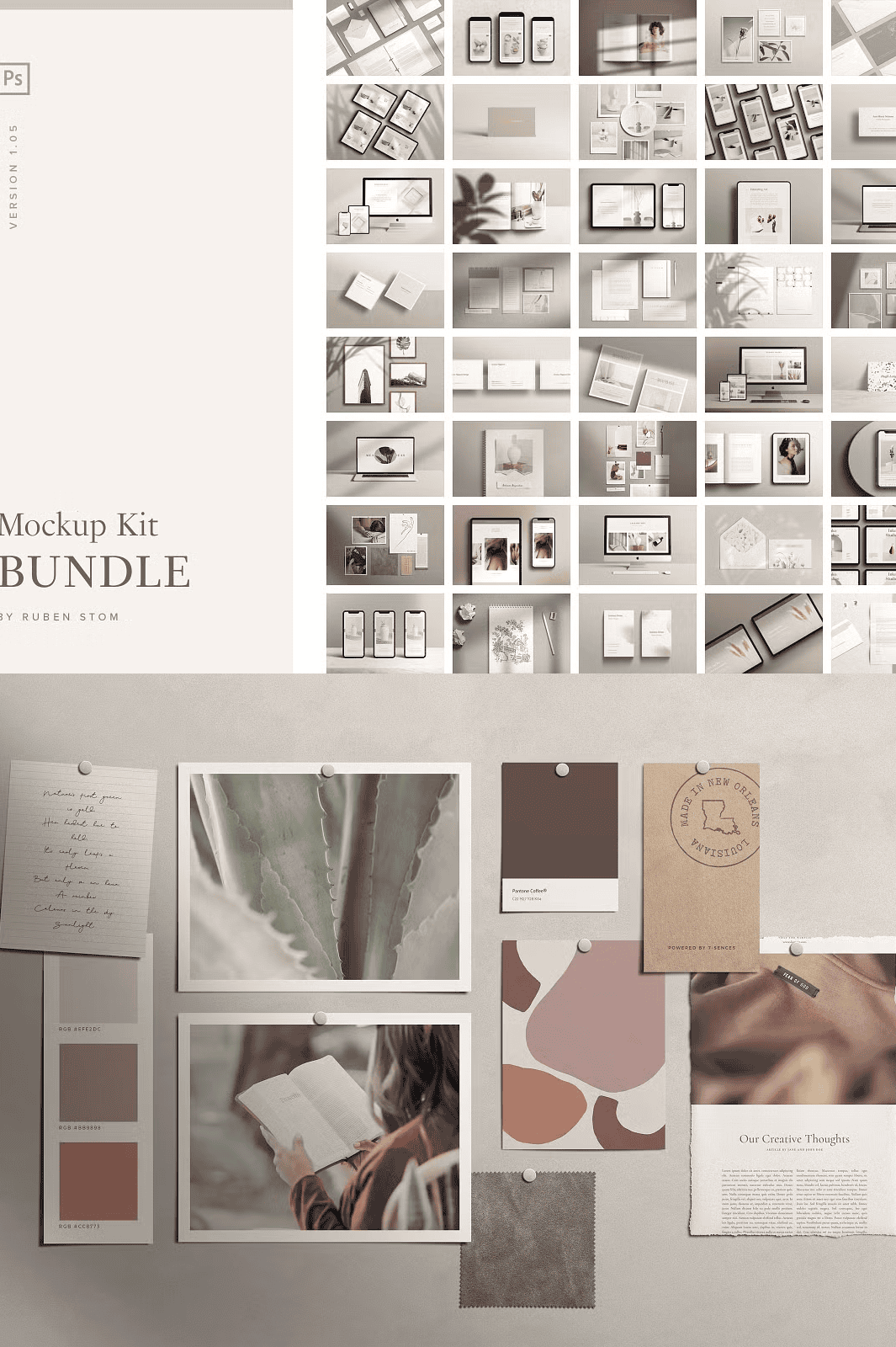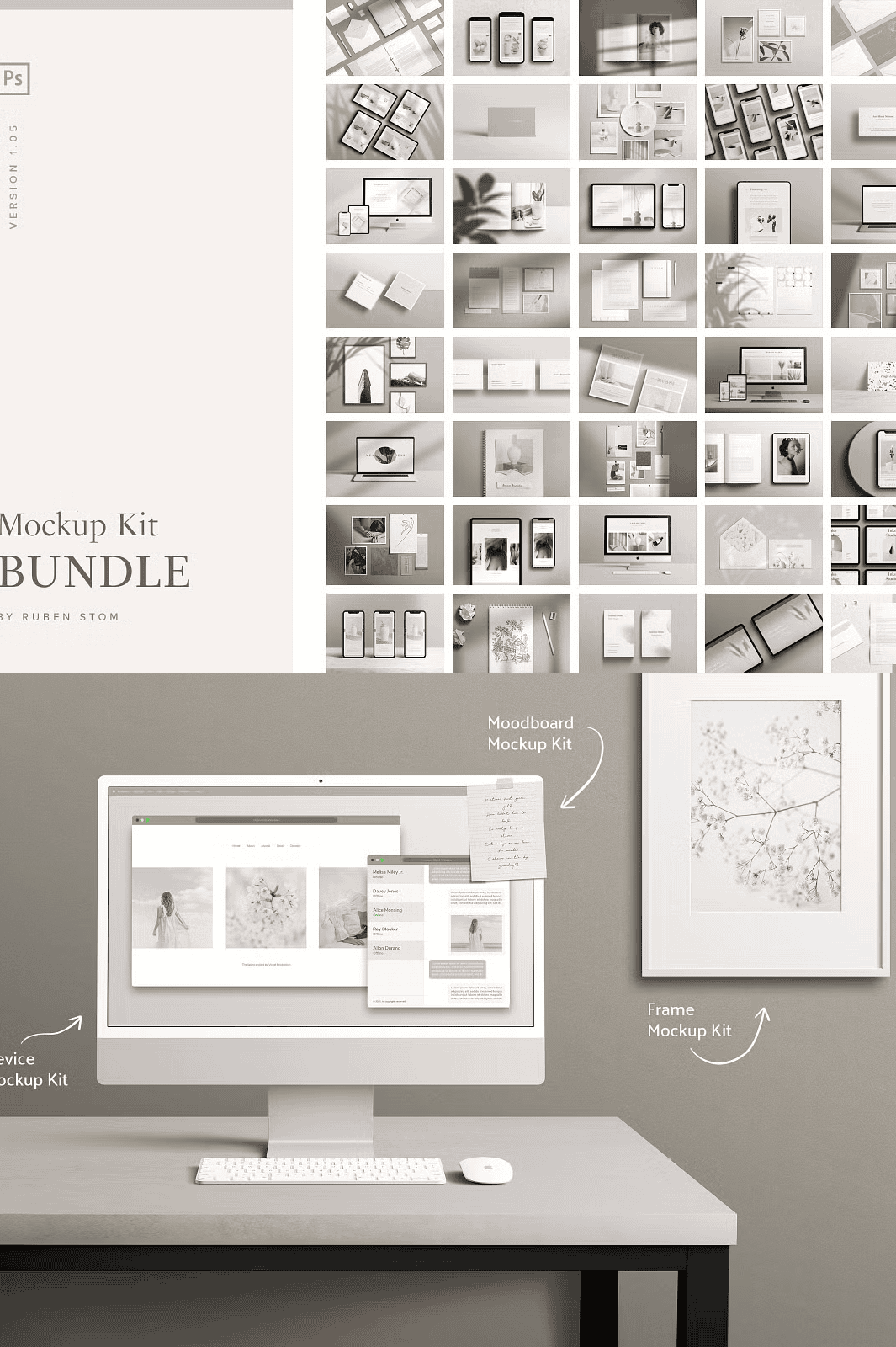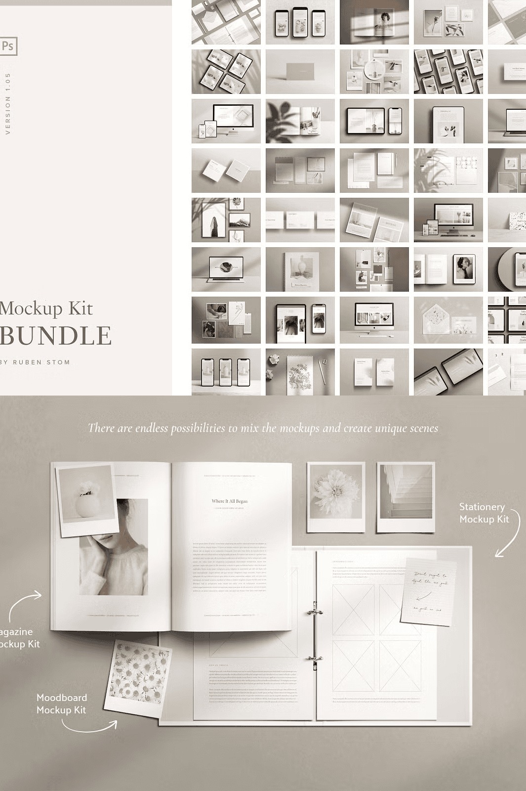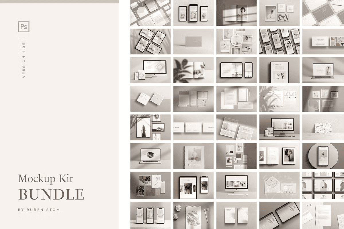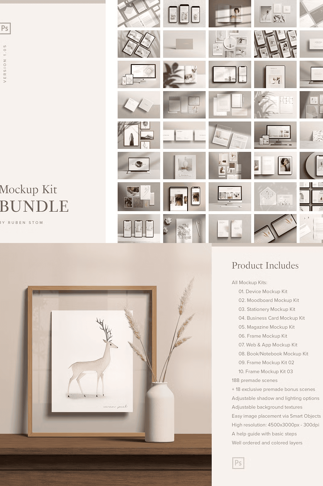 • 188 premade scenes across 10 unique kits: Device, Moodboard, Stationery, Business Card, Magazine, Frame, Web & App, Book/Notebook, and 35 Unique Frame Mockups