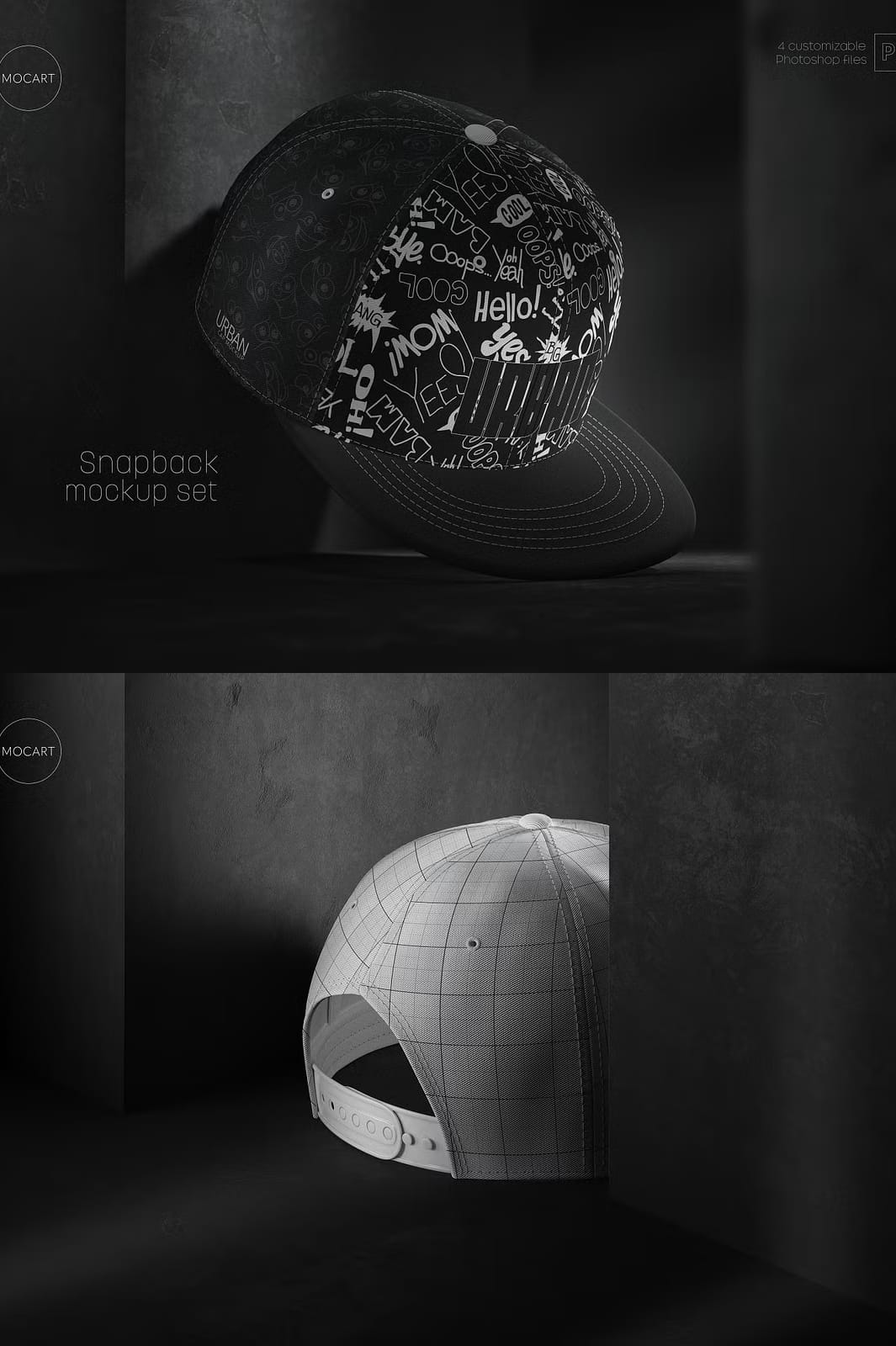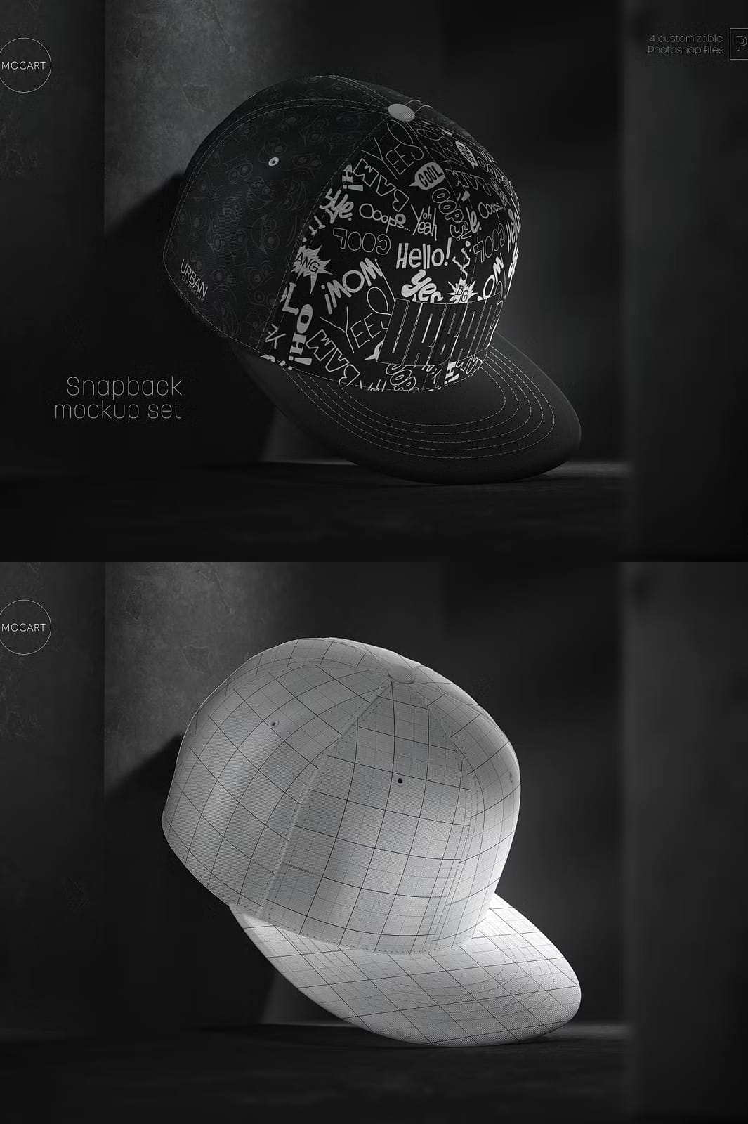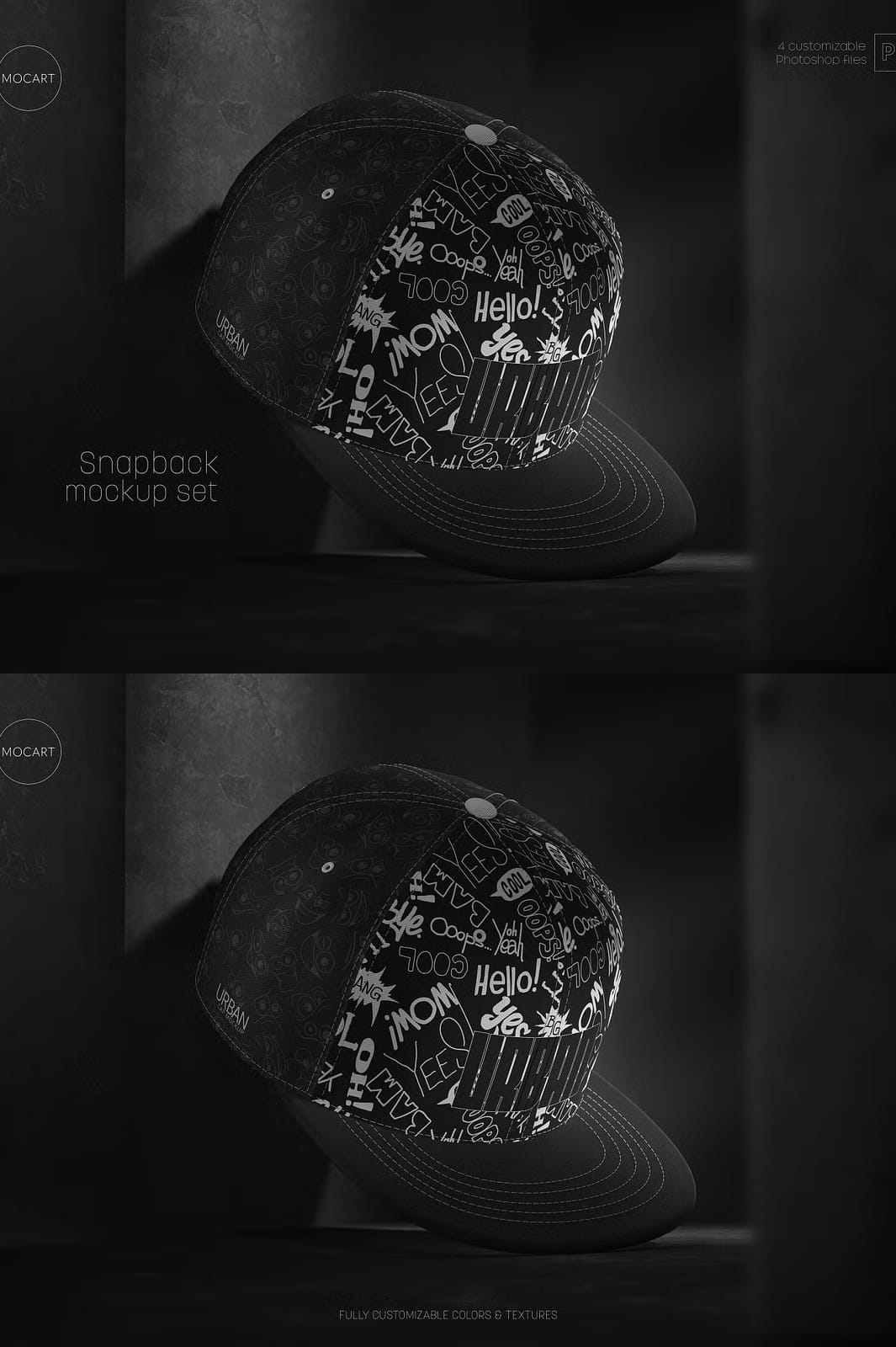 This mockup set enables you to edit every component of the snapback cap, including colors and textures, through smart object layers. You can effortlessly apply custom colors and modify textures on all parts of the cap, providing endless creative opportunities. The mockups feature realistic lighting and shadow effects integrated into each design, preserving authenticity and depth in your presentations. Keep in mind that the shadows and lights are embedded for a natural look and elements are not removable.